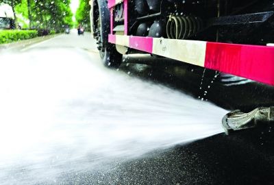 7日下午在唐家墩側(cè)路旁,江漢區(qū)城管局的灑水車正在進(jìn)行灑水測試。記者發(fā)現(xiàn)這臺(tái)灑水車與眾不同:車底部的出水口裝上了一個(gè)“鴨嘴”,噴出的水流呈扇形,且貼近地面,像一把鏟子。